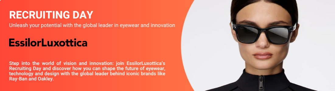 Step into the world of vision and innovation! Join EssilorLuxottica’s Recruiting Day and discover how you can shape the future of eyewear, technology and design with the global leader behind iconic brands like Ray-Ban and Oakley. Don’t miss your chance to meet the Team and explore exciting career opportunities: your next adventure starts here!