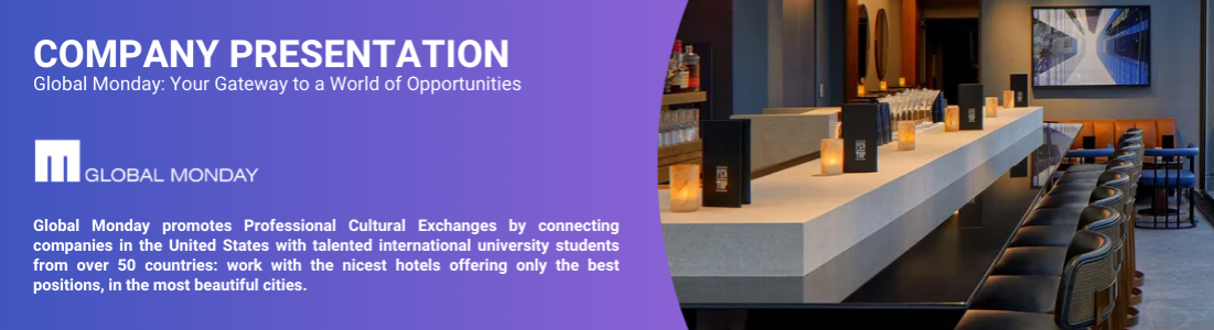 Global Monday promotes Professional Cultural Exchanges by connecting companies in the United States with talented international university students from over 50 countries: work with the nicest hotels offering only the best positions, in the most beautiful cities.